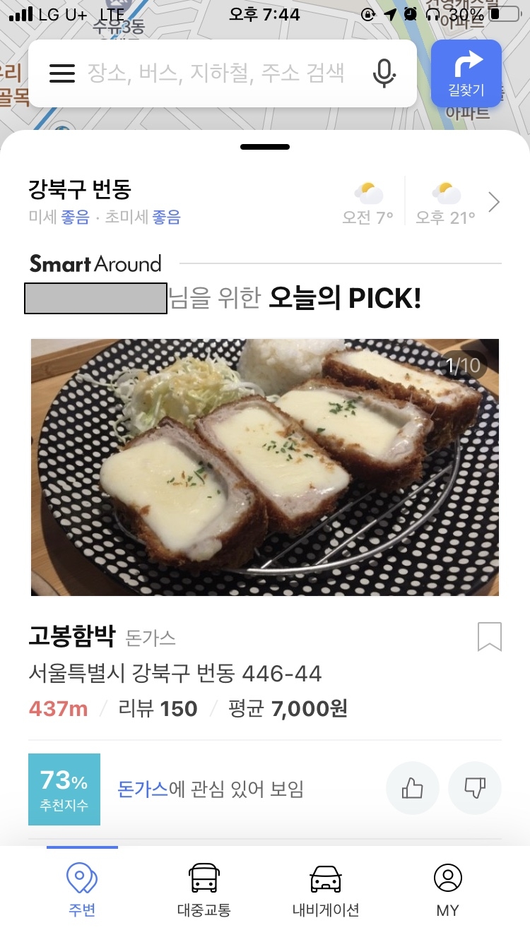 이 사진은 네이버 지도 앱을 실행하자마자 하단의 메뉴를 열었을 때 나오는 페이지입니다. 저 메시지 보이시나요?? 세상에나 [돈가스에 관심 있어 보임]이라니요^^ 보고 한참을 웃었습니다. 참 신기하게 네이버 지도는 제가 돈까스에 관심이 있을 지 어떻게 알았을까요?
