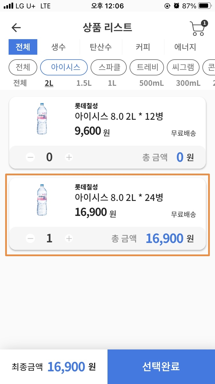 4. 저는 아이시스 8.0 생수 2L 24병짜리를 구매해보았습니다. 원하는 품목의 수량을 추가해주세요.