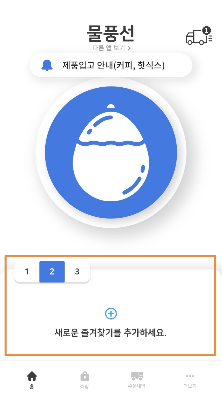 1. 자주 주문하는 품목을 3개까지 즐겨찾기할 수 있습니다. 즐겨찾기 한 생수는 메인의 물풍선 버튼만 눌러주면 등록된 카드로 결제되어 배송 옵니다.