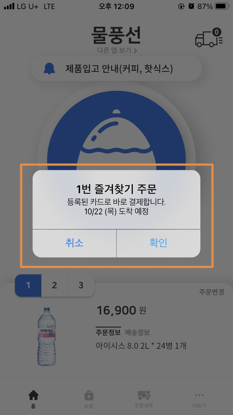 8. 생수 2L 주문을 알려주는 얼럿 창이 뜹니다.