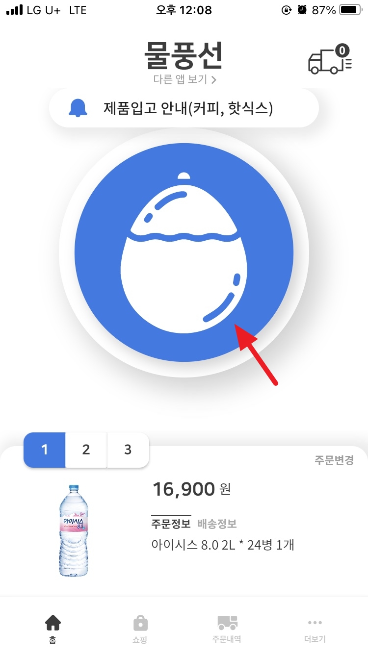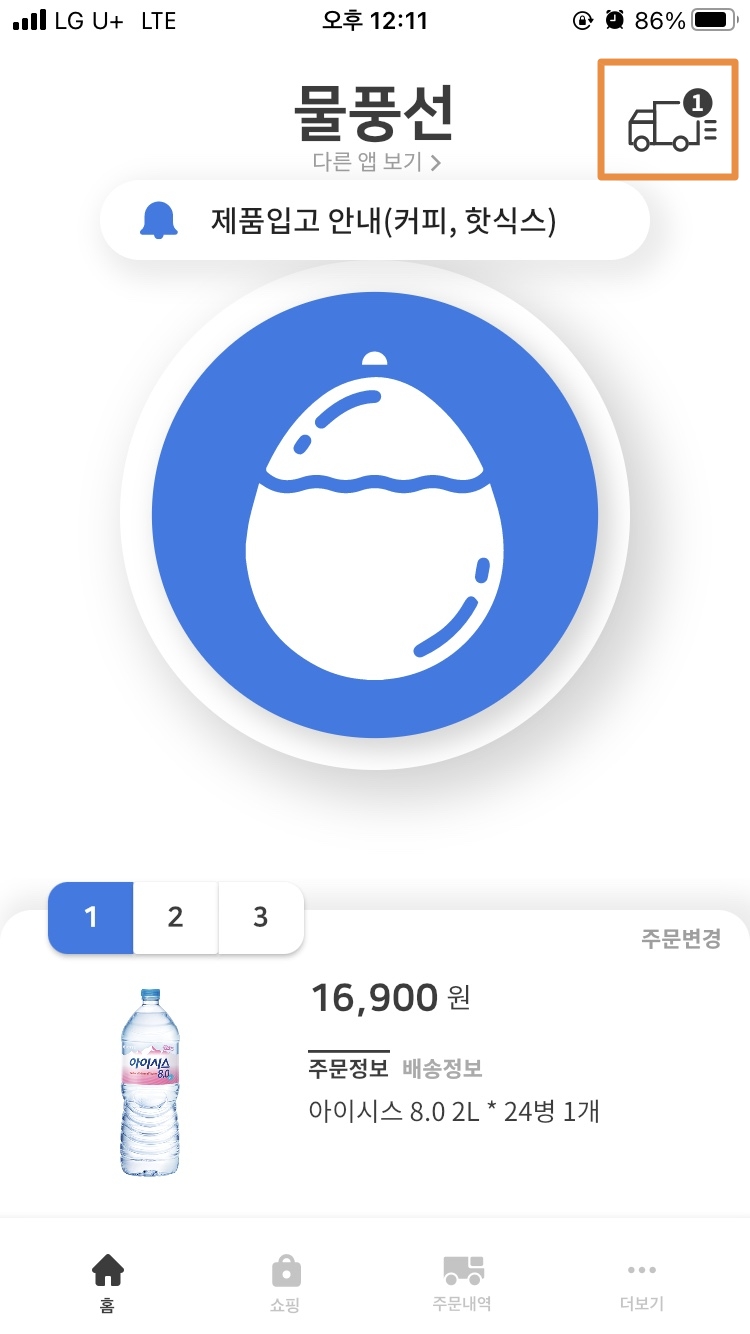 7. 메인 페이지에서 물풍선을 한 번 눌러줍니다. 이미 카드와 즐겨찾기가 등록되어있을 경우 다음부터는 이 물풍선만 누르면 자동으로 결제와 주문처리, 배송까지 이루어집니다. 제일 빠른 물 주문 방법인 것 같습니다.