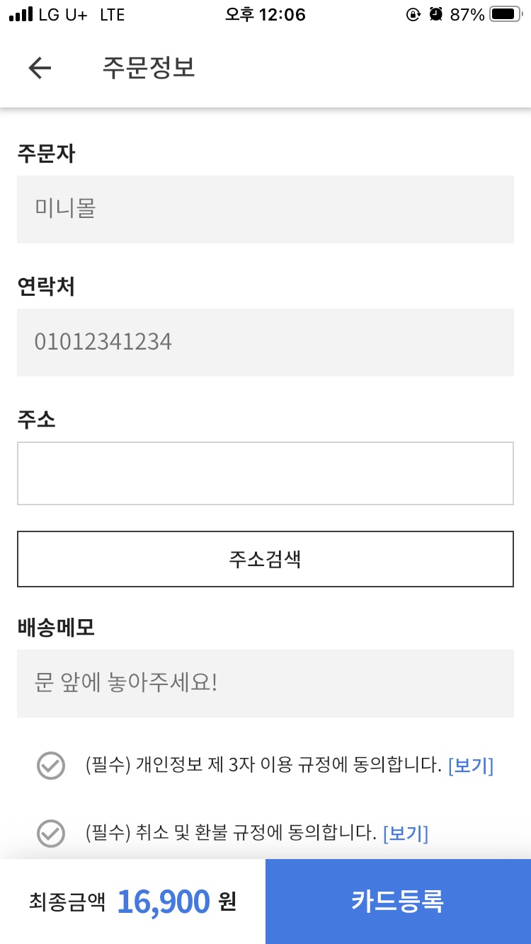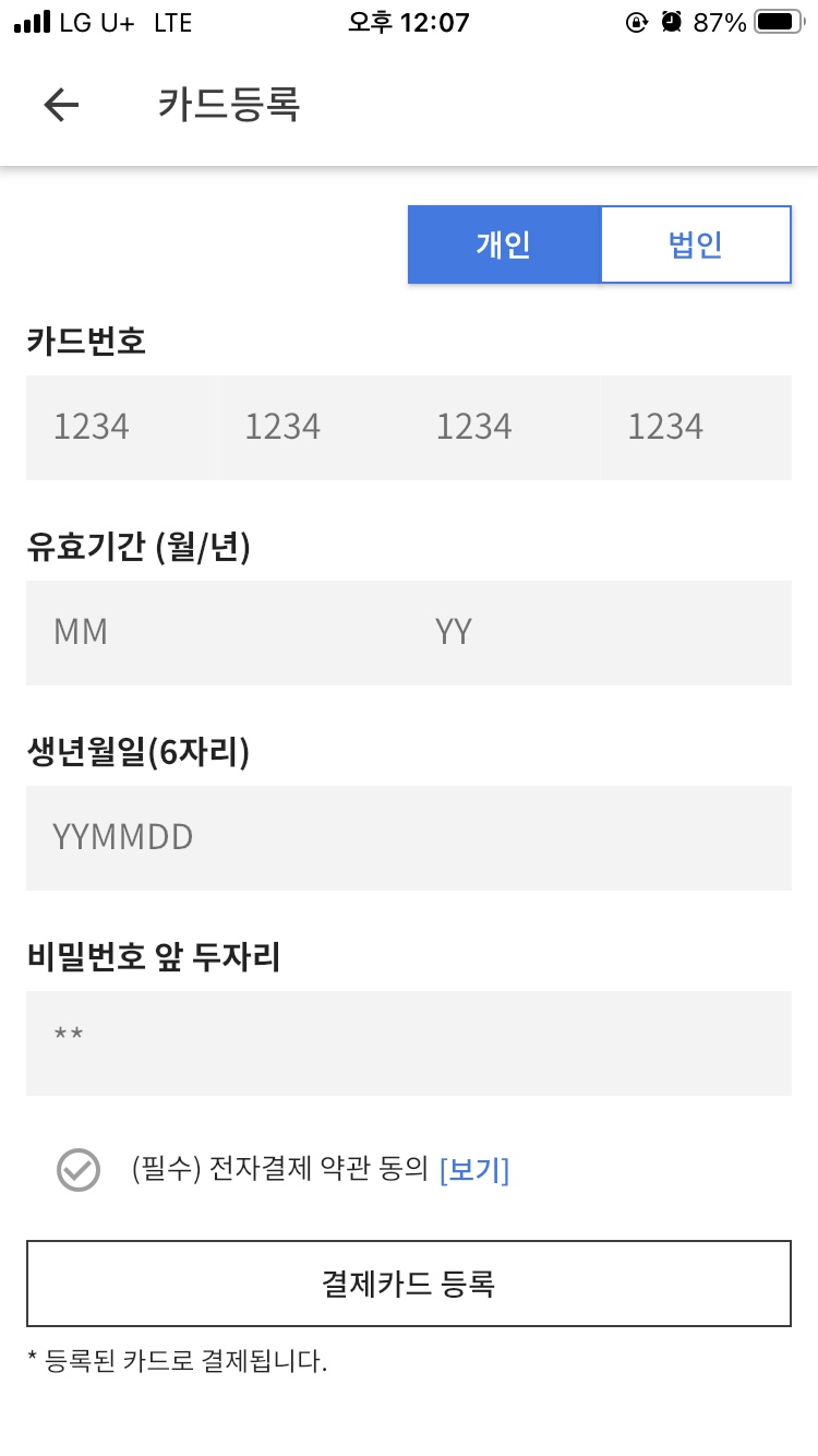 6. 결제할 카드를 등록합니다. 이때 등록된 카드는 앞으로도 쉽고 빠르게 주문하기 위해 사용됩니다.