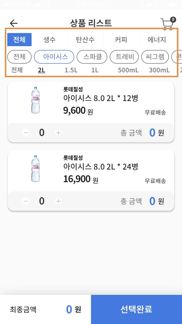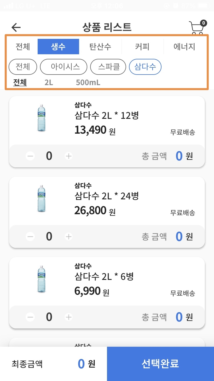 3. 생수 카테고리에서 원하는 생수를 담을 수 있습니다. 생수 2L, 500L로 나눠 용량별로 검색할 수 도 있습니다.