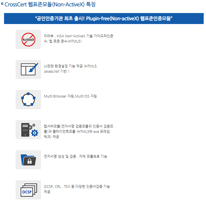 또한 웹표준 인증 모듈을 통해 어떤 브라우저에서도 동일하게 보일 수 있도록 하며, Crosscert UniCRSV3라는 프로그램은 오픈웹을 지향하면서도 높은 보안성을 보장합니다. Crosscert UniCRSV웹표준모델의특징이사이트에 잘 설명되어있었습니다.