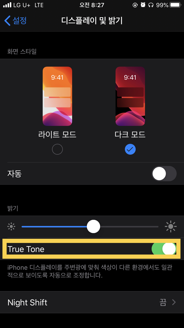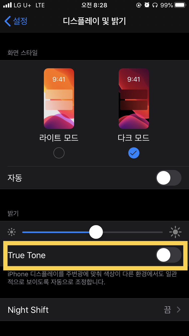 우리 눈에는 아이폰 액정이 누렇게 보여서 꺼버리는 설정이지만 아이폰에서는 위 디바이스 이미지에 설명되어있듯이, 아이폰 디스플레이를 주변광에 맞춰 색상이 다른 환경에서도 일관적으로 보이도록 자동 조정해주는 좋은 기능입니다.