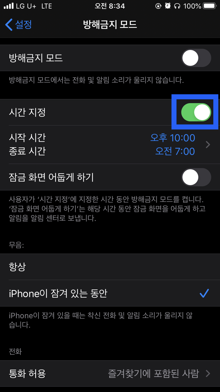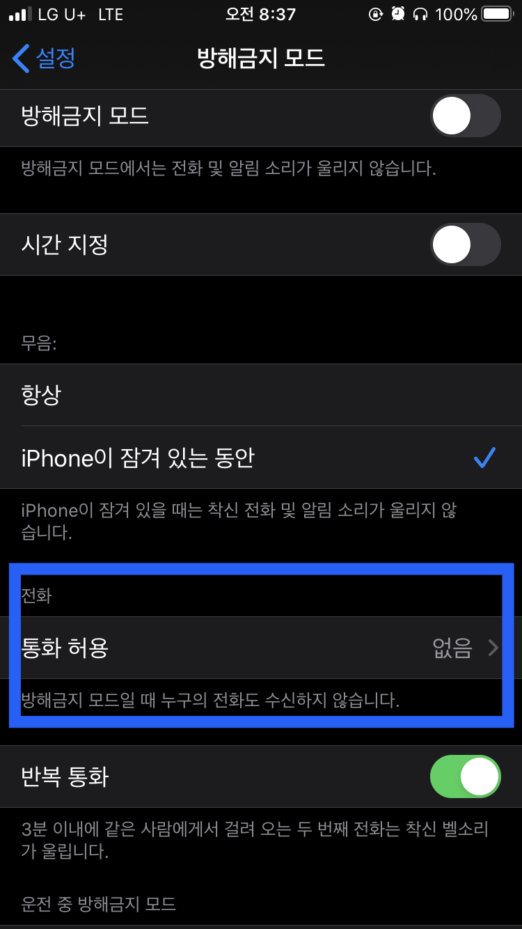 아이폰 방해금지 모드에서 통화 허용으로 들어갑니다