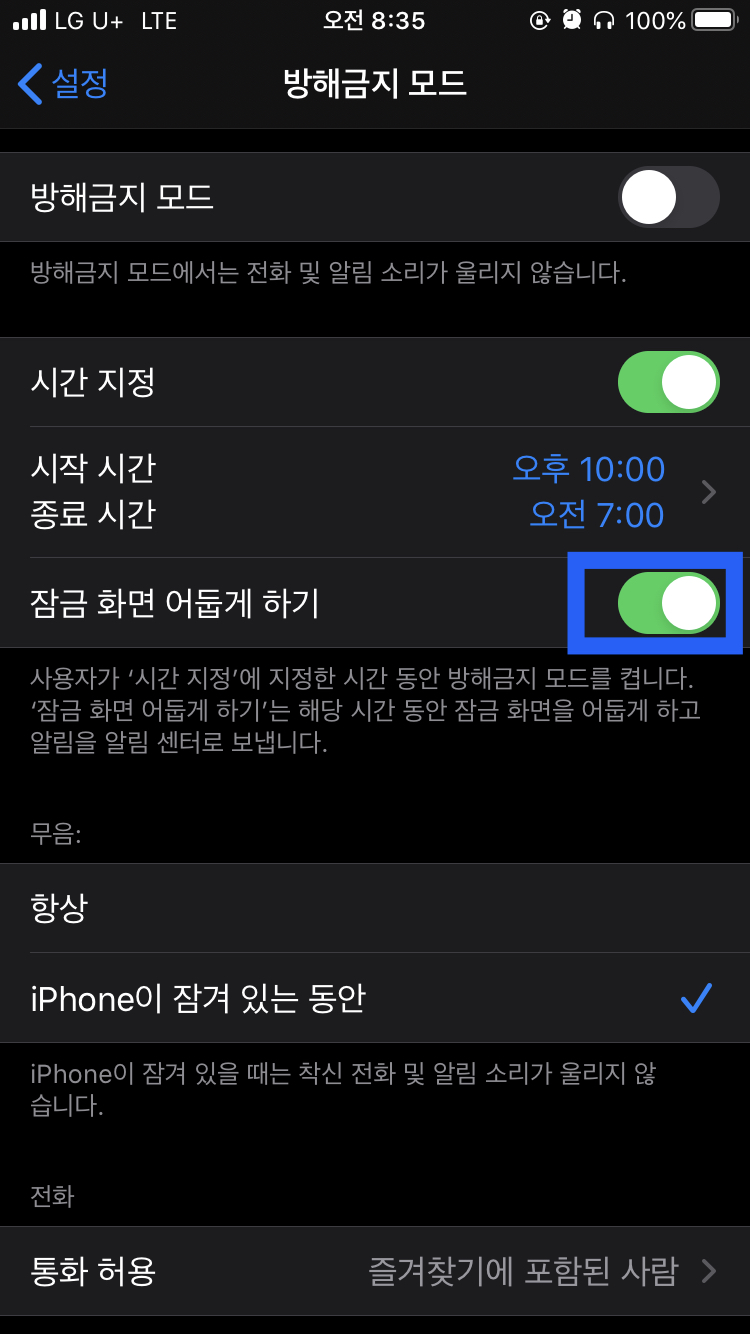 '잠금 화면 어둡게 하기'는 아이폰 방해금지모드 시간 동안 잠금화면을 어둡게 해 줍니다.