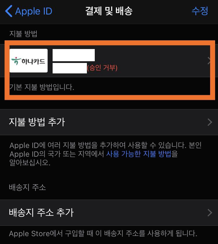 아이폰 카드 승인 거부되어서 지불정보 사용이 불가한 경우 결제 카드 등록 및 변경, 그리고 삭제 모두 생각보다 간단하니 필요하신 경우 도움이 되었으면 좋겠습니다!!